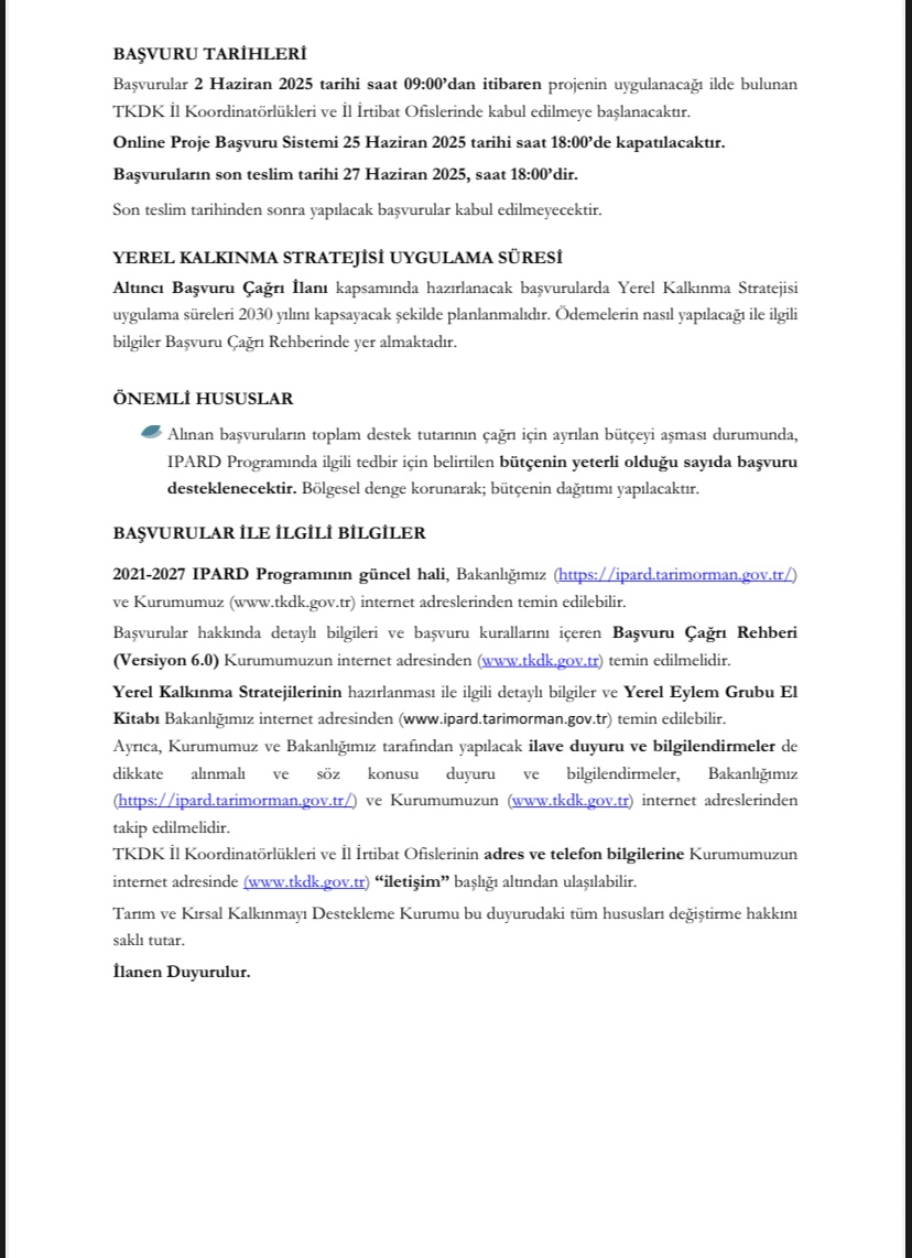 - Tarım ve Kırsal Kalkınmayı Destekleme Kurumu tarafından IPARD III Programı Yerel Kalkınma Stratejilerinin Uygulanması-LEADER Yaklaşımı Tedbiri Altıncı Başvuru Çağrı İlanı Yayımlanmıştır